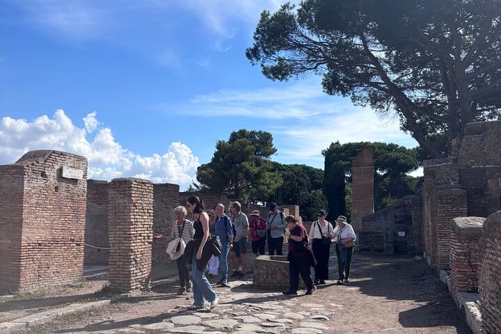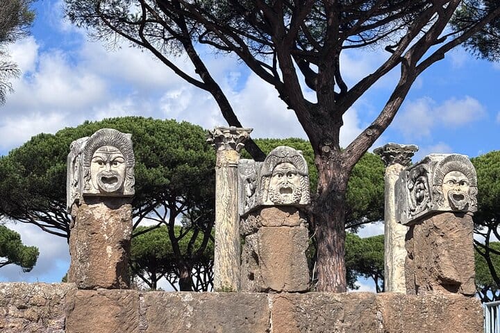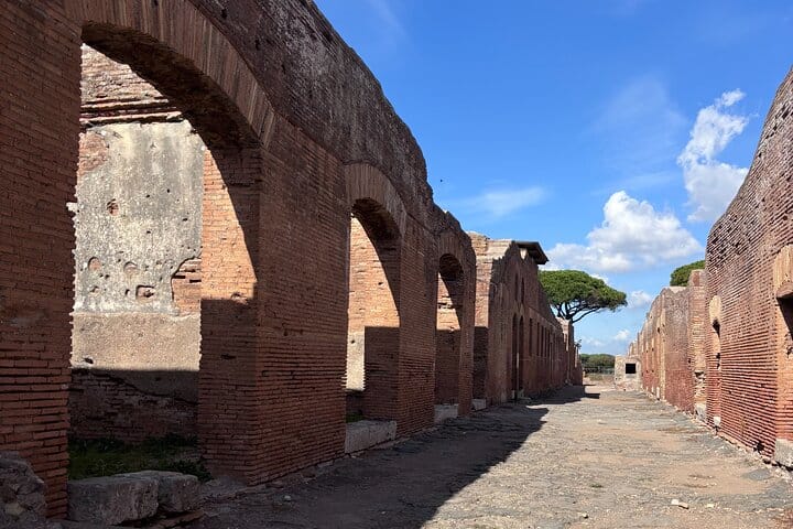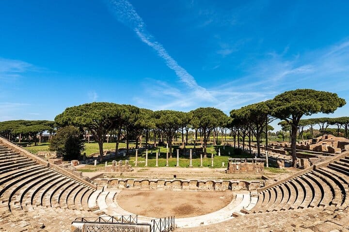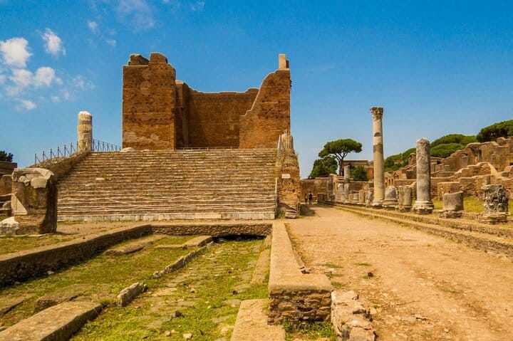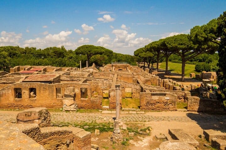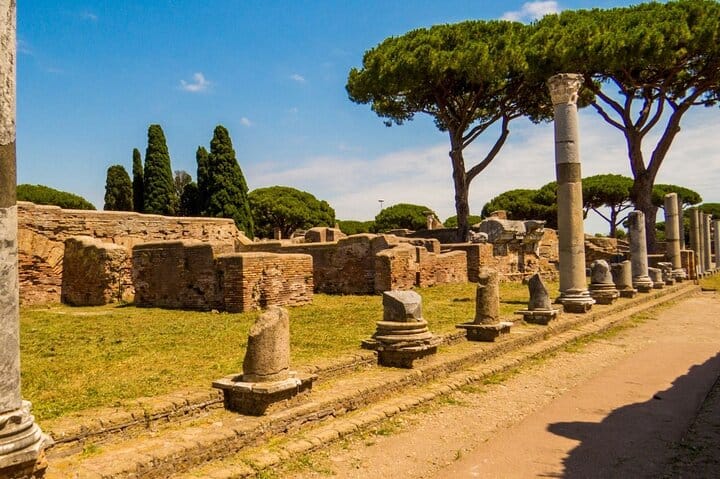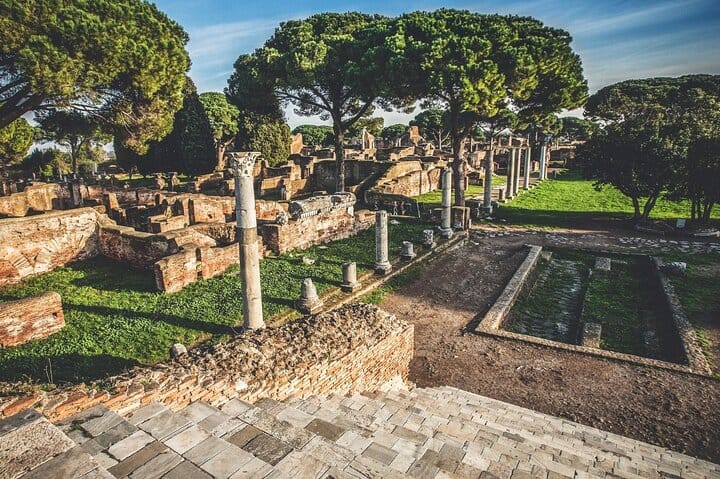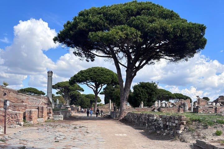 Step outside Rome and discover Ostia Antica, the ancient seaport and one of Italy’s most atmospheric archaeological parks. Walk along stone-paved streets and shaded paths lined with maritime pines, where mosaics, shopfronts, and public buildings make Roman life easy to imagine.